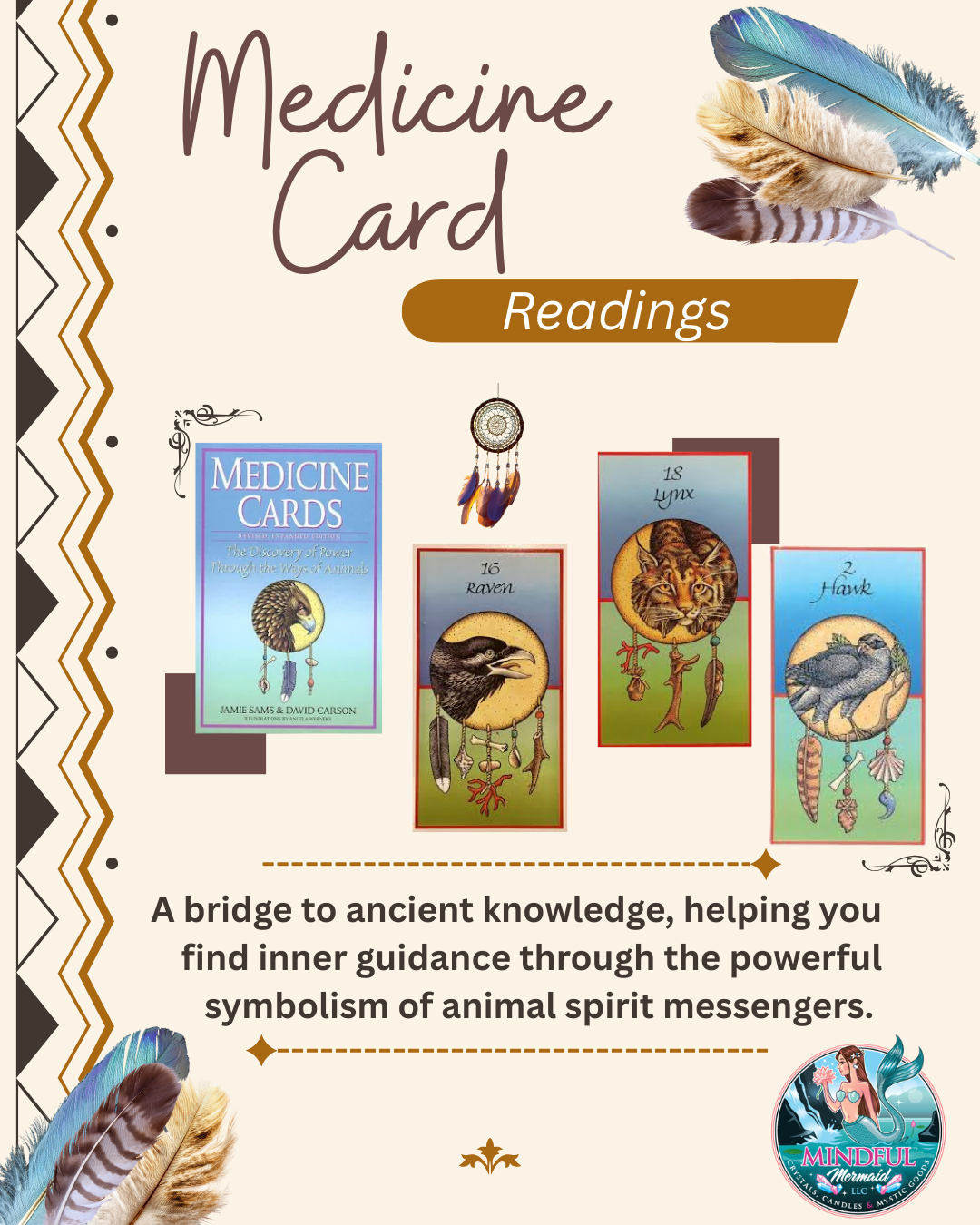 The Medicine Cards draw upon the symbolic teachings of animal spirit messengers, offering insight into life paths, challenges, and opportunities for growth. Each reading serves as a bridge between ancient wisdom and present-day questions, helping clients reconnect with their inner knowing and gain a deeper understanding of the energies influencing their journey.