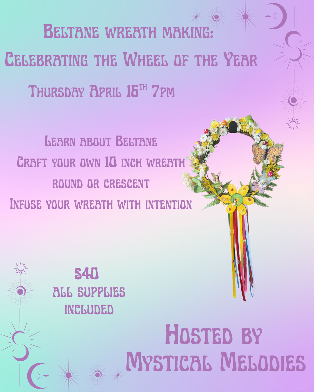 Celebrate the turning of the wheel, ignite your creativity, and craft a stunning Beltane wreath to welcome passion, fertility, and abundance into your home and spirit!